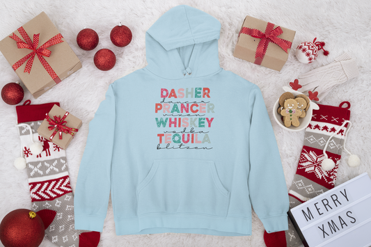 Dasher Dancer Prancer Whiskey Vodka Tequila Blitzen Unisex Fleece Pullover Hooded Sweatshirt